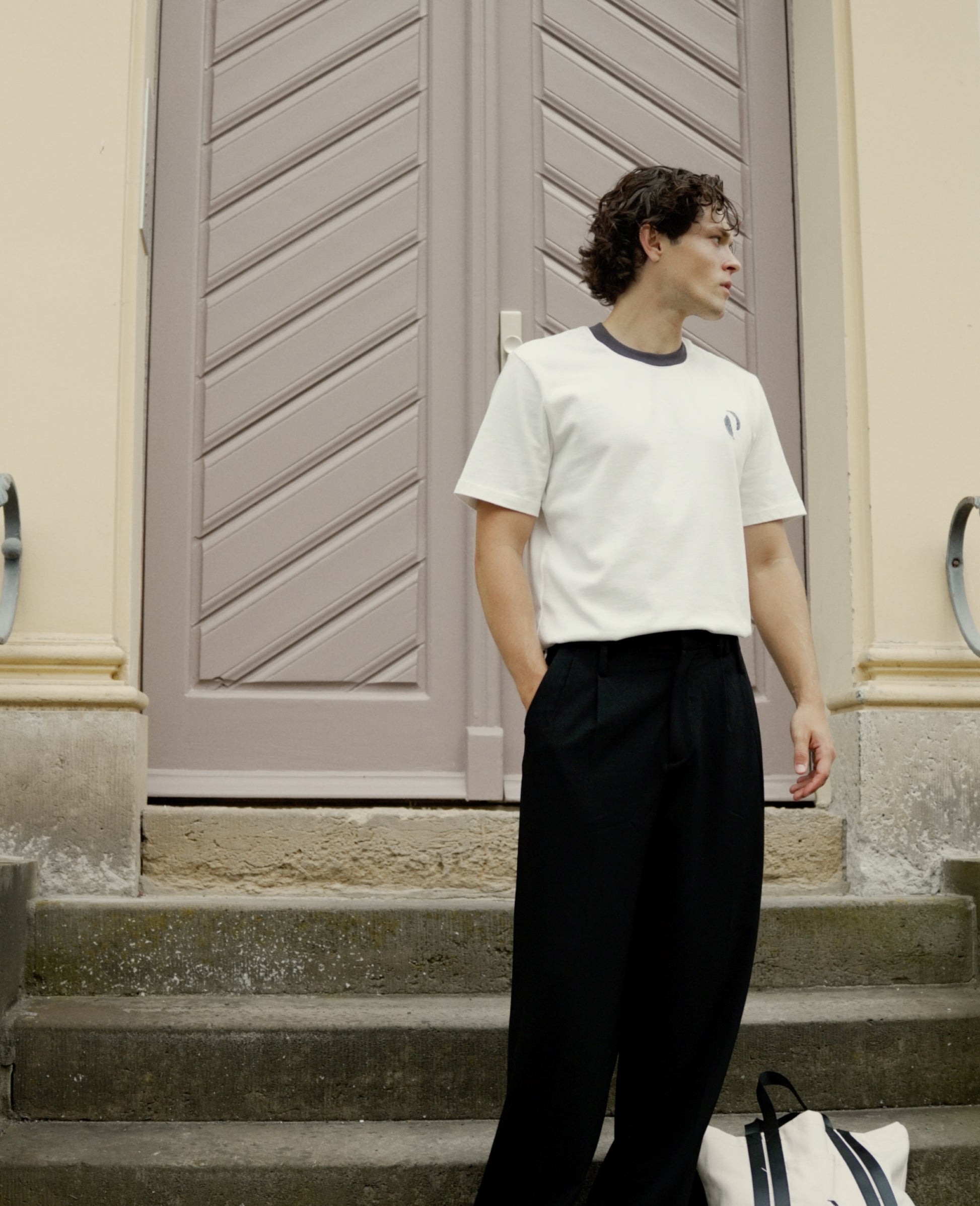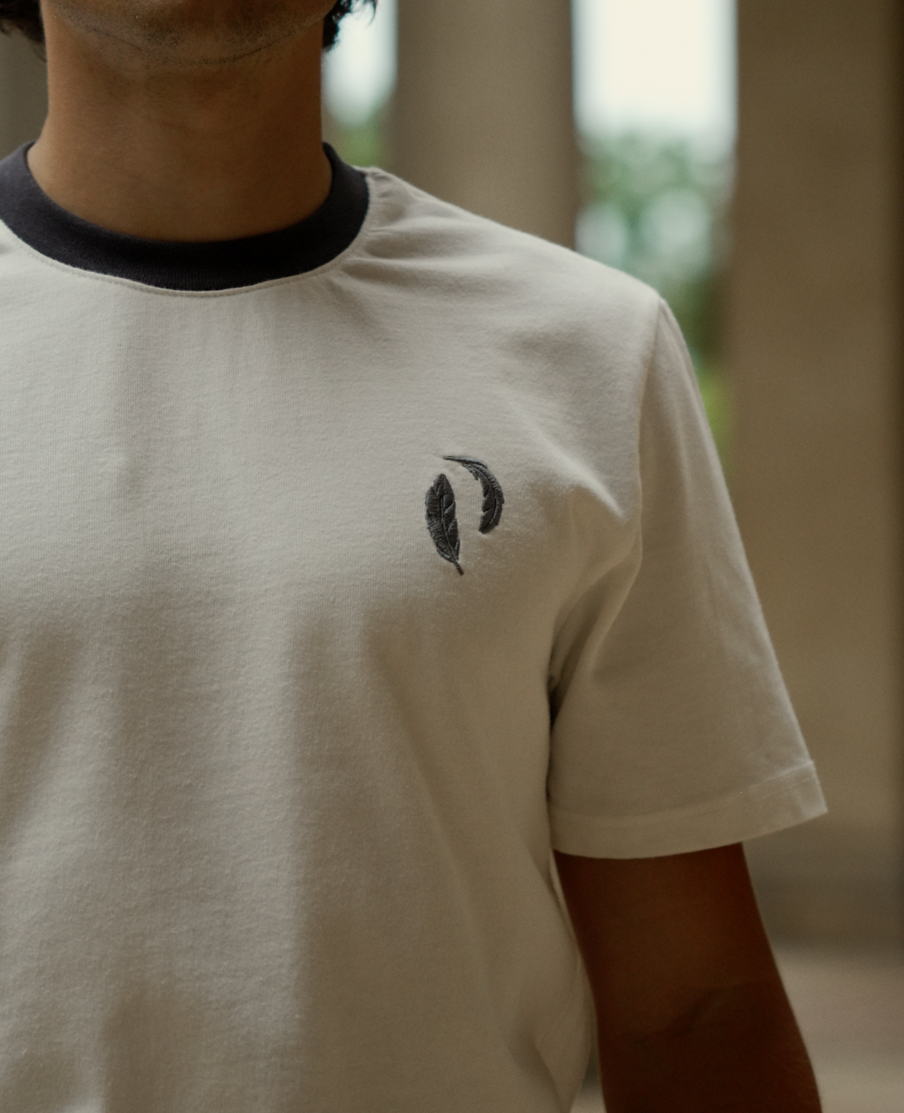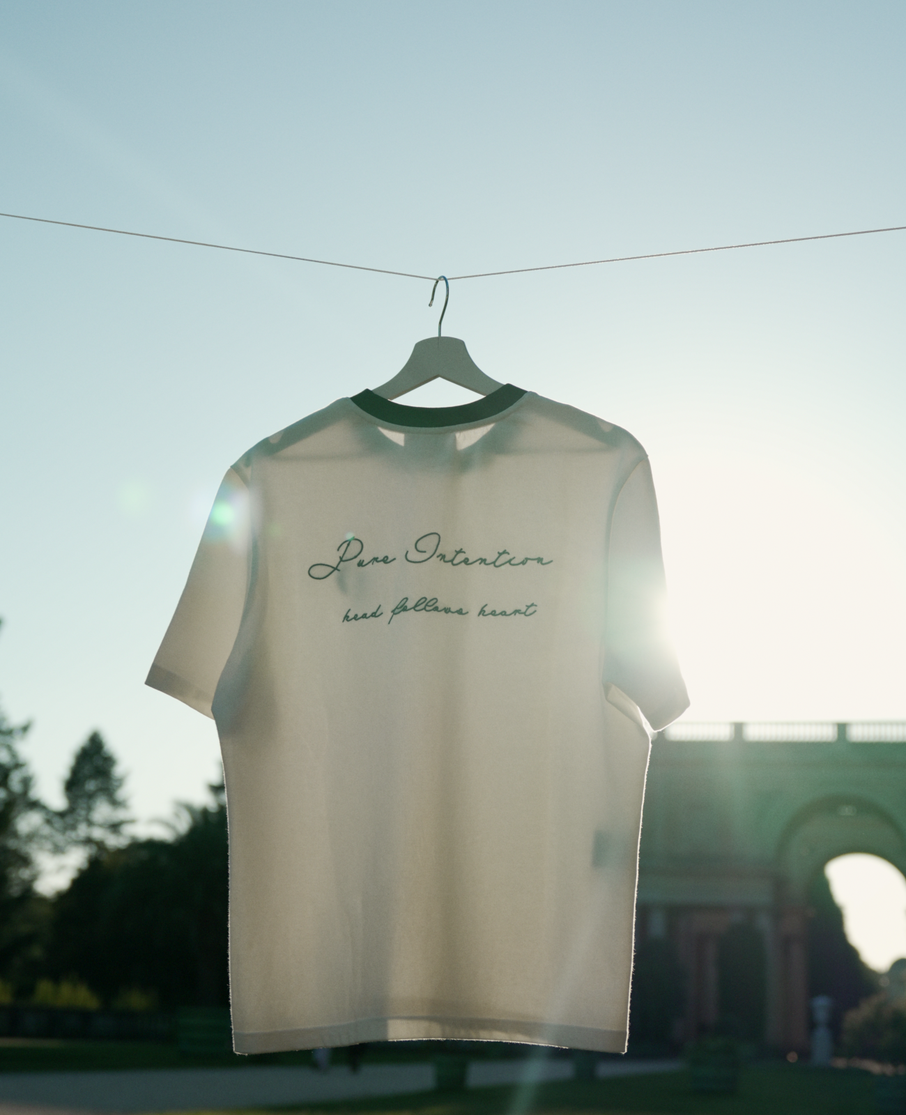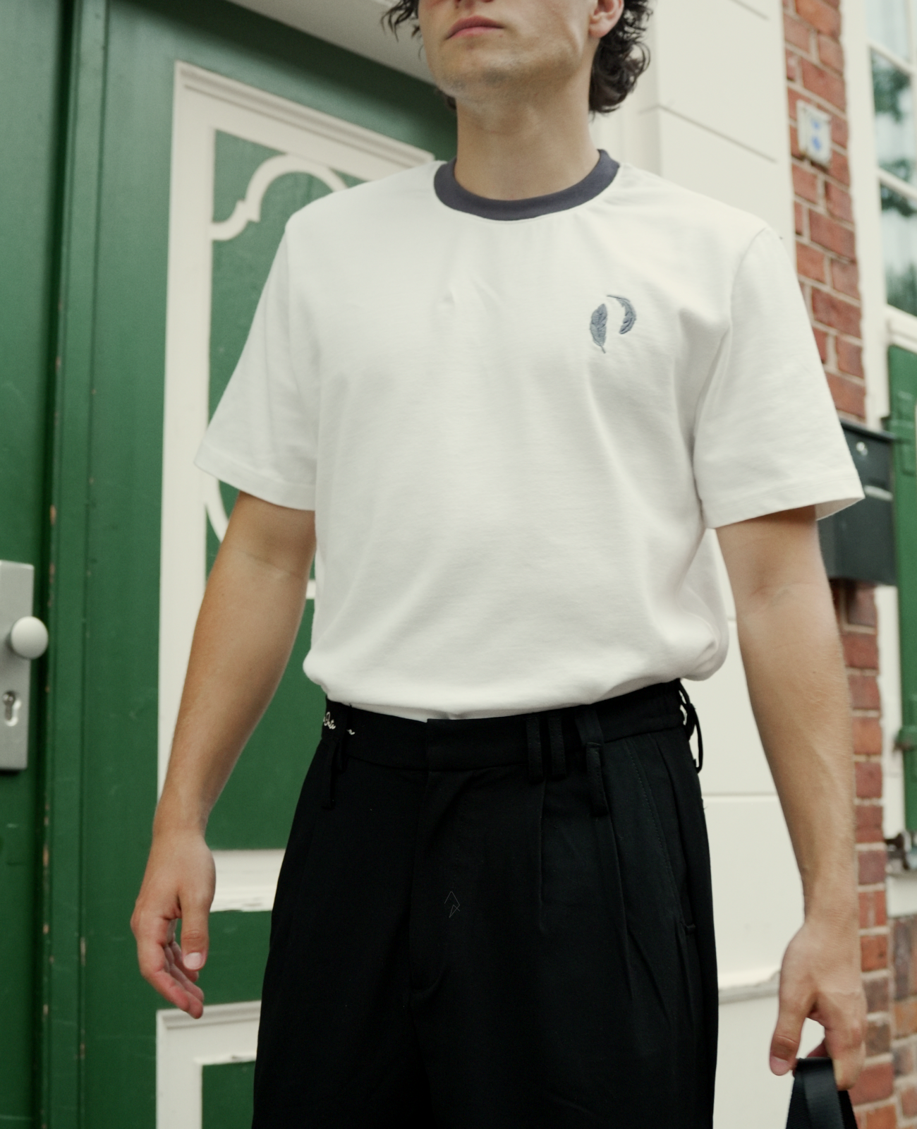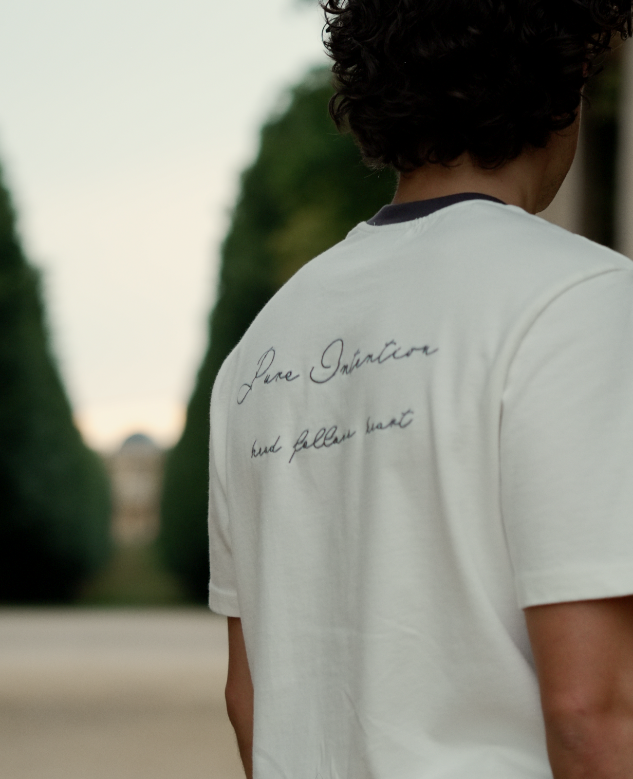 Der weiche, schwere Baumwollstoff umschmeichelt die Haut und sorgt für höchsten Tragekomfort. Der elegante schwarze Kragen setzt einen edlen Akzent. Die kunstvolle Stickerei auf der Brust ist ein Blickfang und der handgestrickte Schriftzug auf dem Rücken verleiht dem Shirt eine persönliche Note. Ein zeitloses Kleidungsstück, das Qualität und Stil vereint. Es fällt size to size aus, das Model ist 184cm und trägt M.